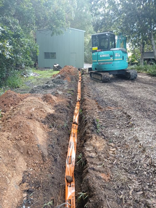 Running underground sub-mains involves the installation of mechanically protected cabling through conduit, which must be trenched at the appropriate depth and backfilled correctly. On rural properties, this often necessitates collaboration with an earthworks contractor for the trenching process. The electrical connections at both ends, including those at the main switchboard and the shed sub-board, must be executed by licensed electrical professionals. We manage the entire process, overseeing earthworks, so you only need to communicate with one point of contact instead of juggling multiple trades, thereby making the project more streamlined and efficient.